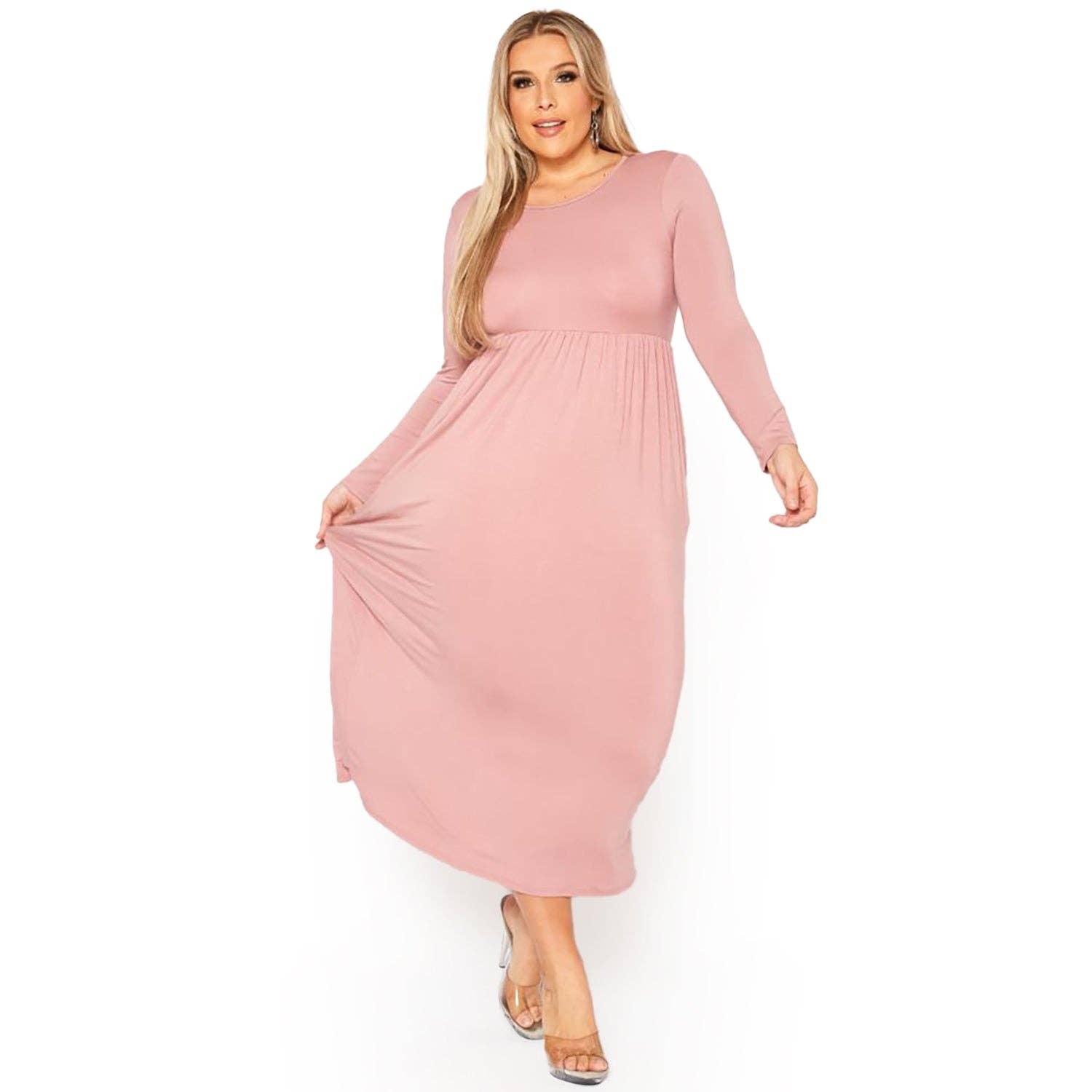 Long sleeve maxi-dress, comfortable fit, soft stretchy fabric. Great for your fall collection. Polyester, Rayon & Spandex